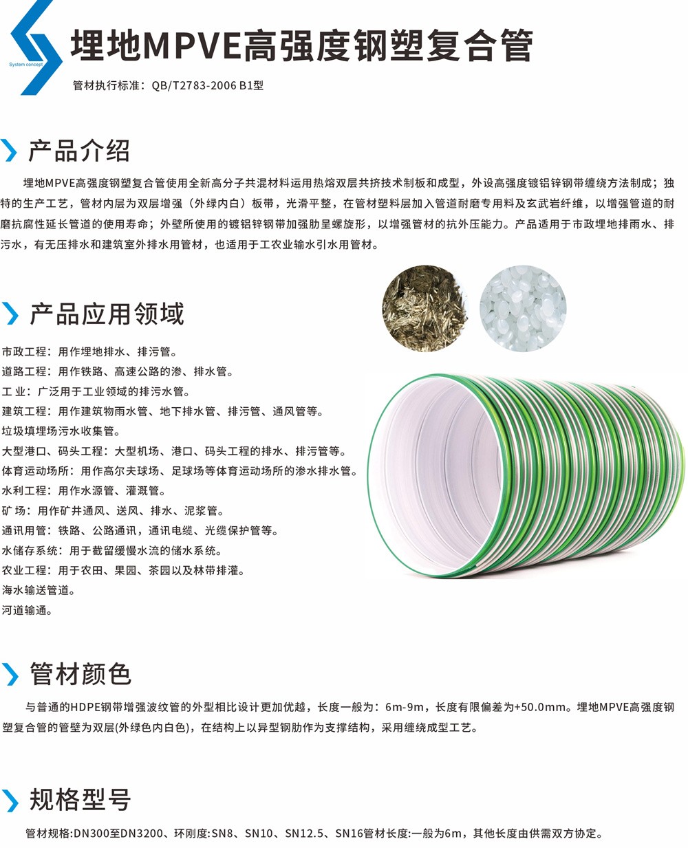埋地MPVE高强度钢塑复合管使用全新高分子共混质料运用热熔双层共挤手艺制板和成型,,,,,外设高强度镀铝锌钢带纠葛要领制成;;;奇异的生产工艺,,,,,管材内层为双层增强(外绿内白)板带,,,,,平滑平整,,,,,在管材塑料层加入管道耐磨专用料及玄武岩纤维,,,,,以增强管道的耐磨抗腐性延伸管道的使用寿命;;;外壁所使用的镀铝锌钢带增强肋呈螺旋形,,,,,以增强管材的抗外压能力。。。。。。。产品适用于市政埋地排雨水、排污水,,,,,有无压排水和修建室外排水用管材,,,,,也适用于工农业输水引水用管材。。。。。。。